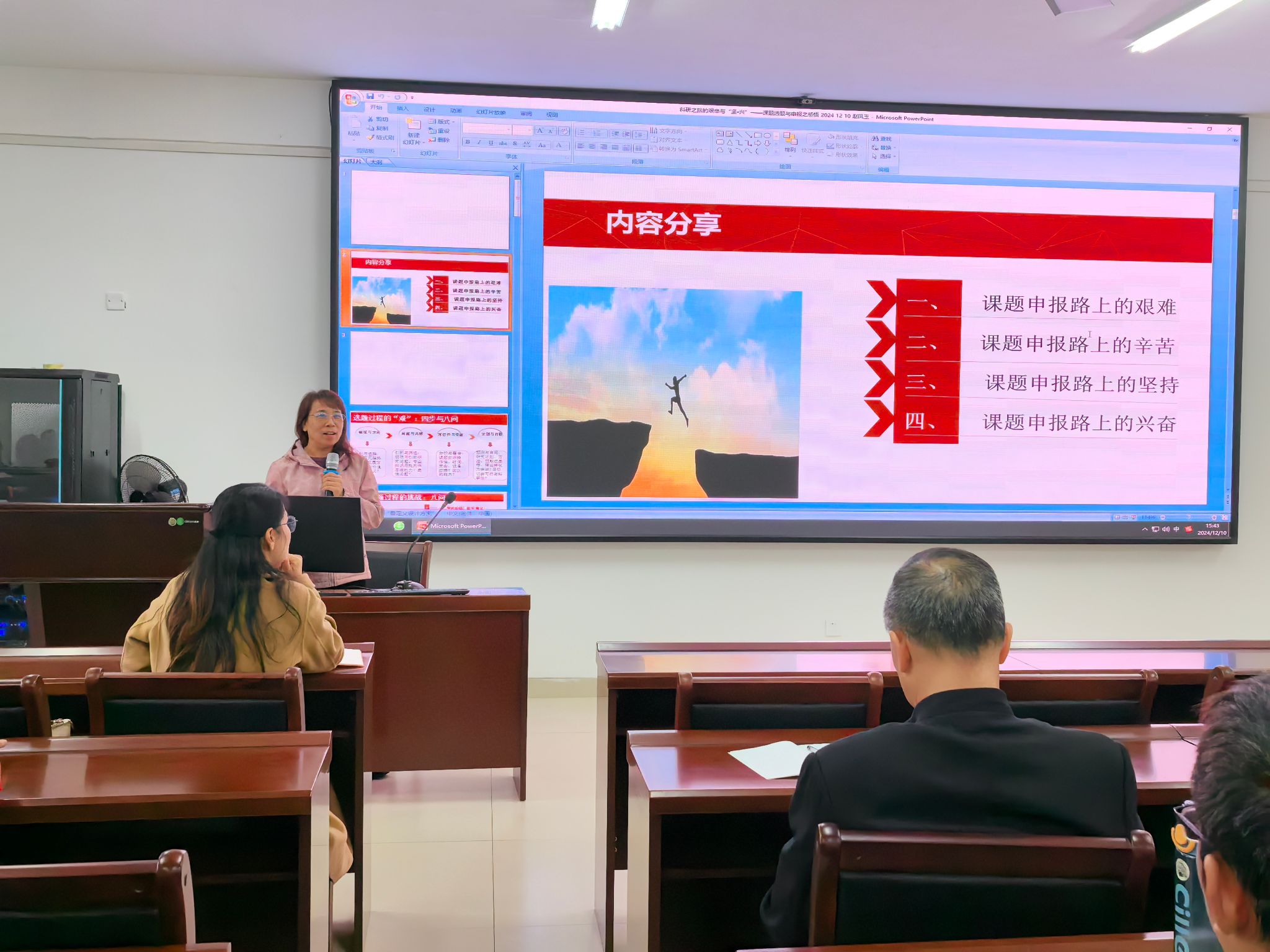 随后,黄信博士、赵凤玉教授、江玉娥教授分别从不同维度分享了他们在课题申报方面的宝贵经验。黄信博士强调了社科项目申报中研究的可行性和政策支持热点问题的重要性,并巧妙地展示了如何高效选题。赵凤玉教授在此基础上,探讨了选题过程中需要自问的“八个问题”,强调选题的实践性,并结合个人经验,分享了面对科研挑战时的心态调整。江玉娥教授则深入讨论了课题准备阶段的准备工作,其见解深刻,引人深思。