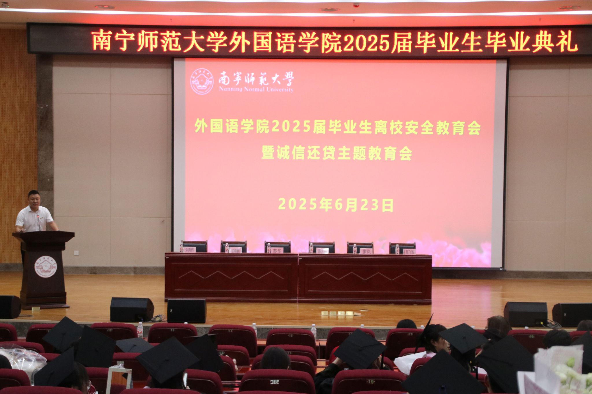 在武鸣图书馆报告厅召开2025届毕业生离校安全教育会暨诚信还贷主题教育专题会议,会议由院党委副书记刘晖晖主持。