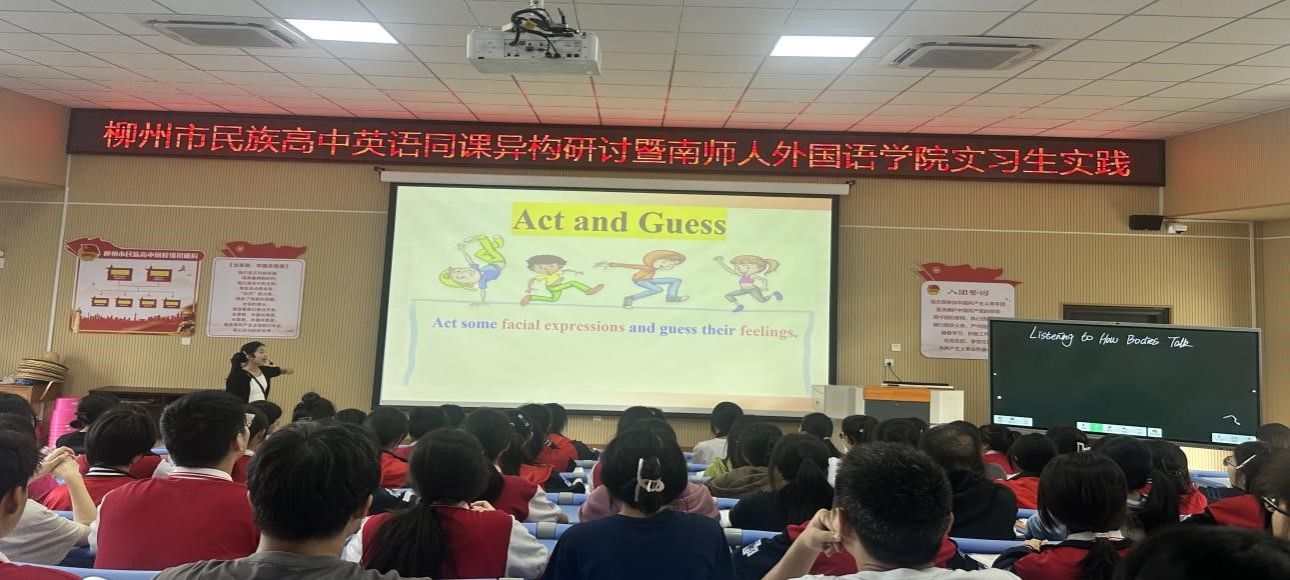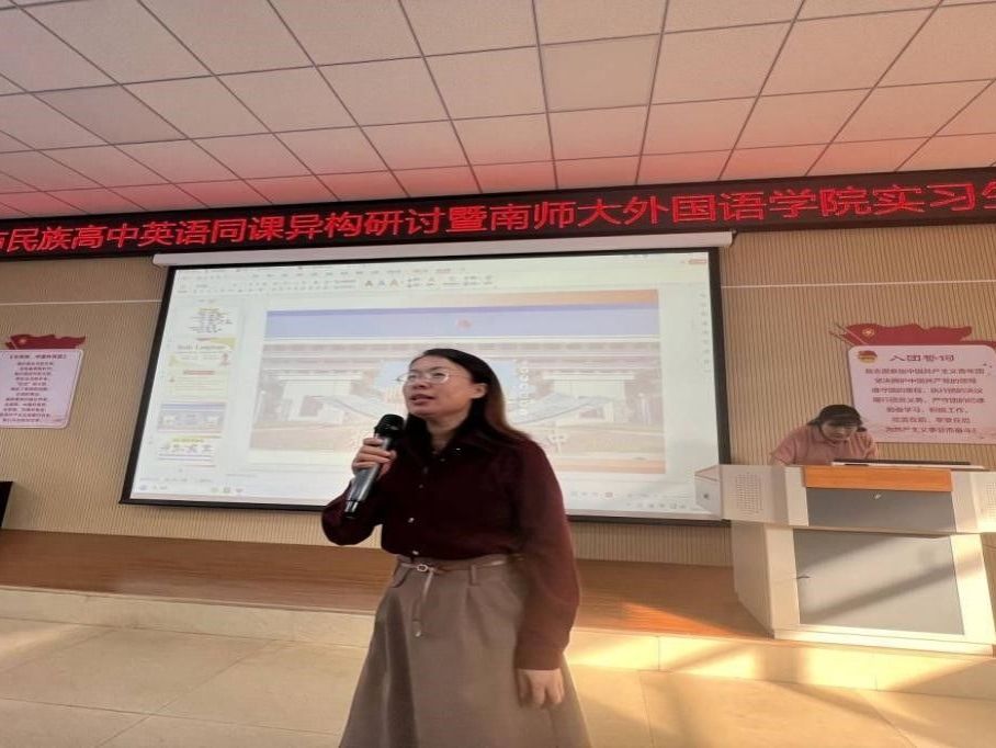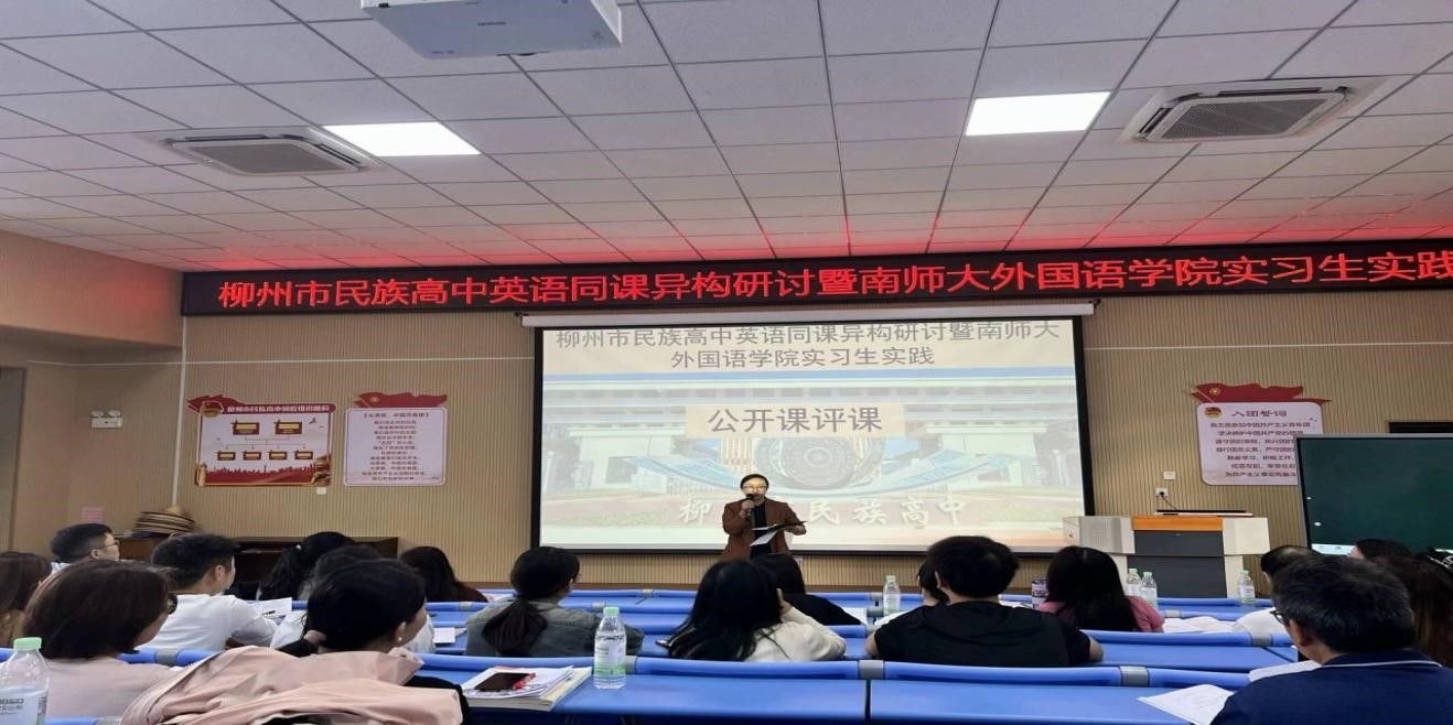 2020级英语专业实习生、带队老师刘婷婷和柳州市民族高中英语课程教研组教师们在柳州民族高中合班教室共同开展了“英语同课异构研讨暨南宁师大H图书馆