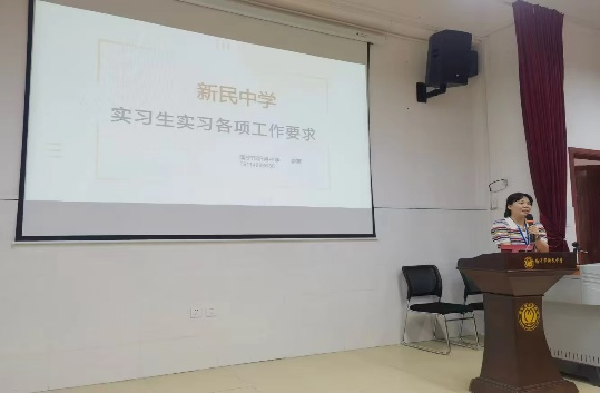的2021英语行知班全体学生以及带队林绍丽老师,并且为实习生进行了细致的岗前培训。李老师指出,实习生们在实习过程中应注意为人师表,不体罚学生,对作业完成质量较低学生进行人文关怀,给学生们做好榜样;并鼓励同学们积极参加每周三下午的备课组会议,聆听优秀老师的意见和建议;最主要的是公开课不少于四节。除此以外,李老师根据宿舍管理、请假要求、安全管理等方面一一给实习生们解释实习过程中的注意事项,让实习生熟悉了新民中学的学校管理制度,以便尽快融入实习工作和生活。