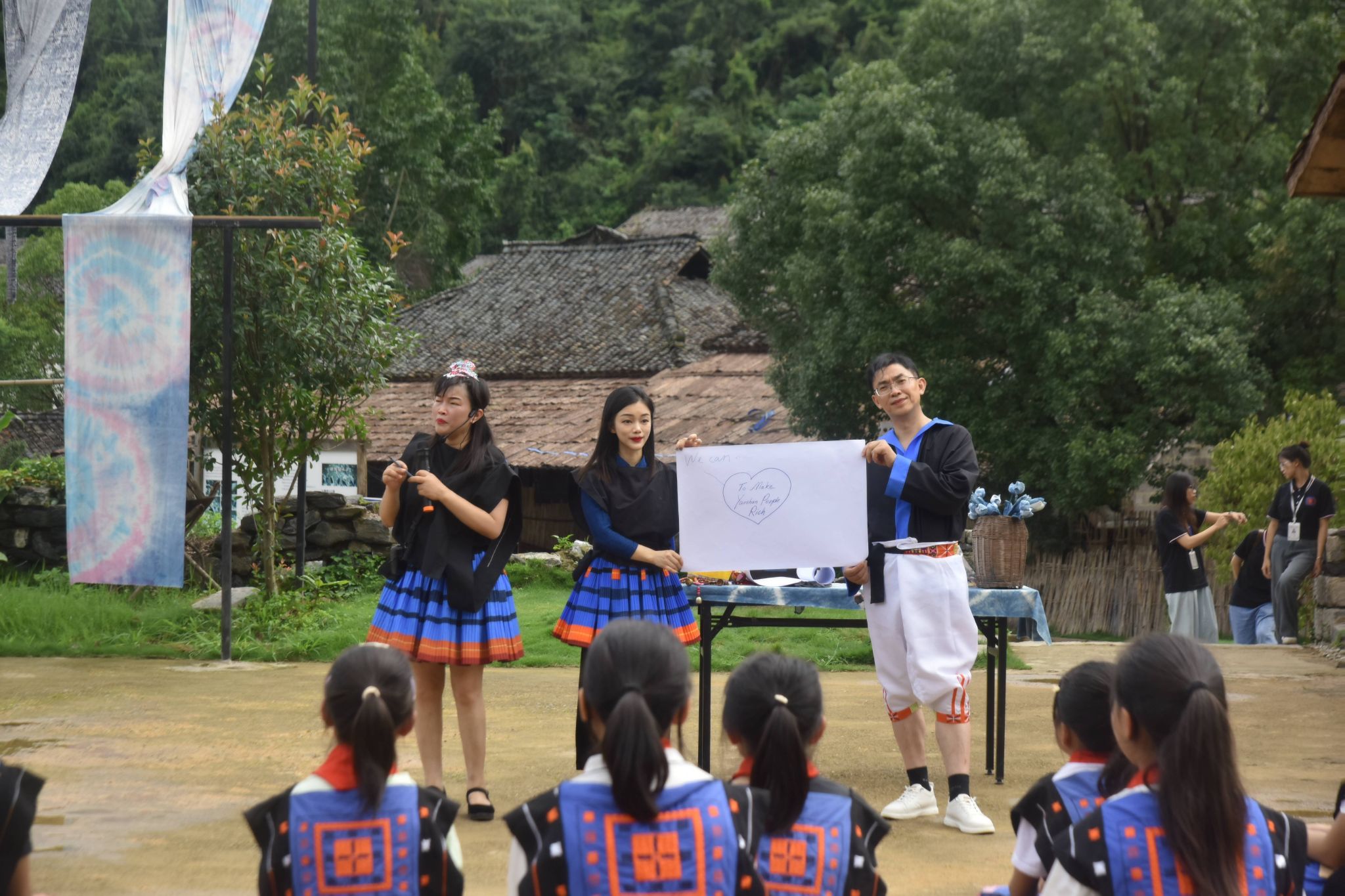 副院长高飞雁给荔波县瑶山民族小学五年级的学生上了一节题为《瑶山五变》的英语教育戏剧课。本节课在荔波县瑶山古寨标志性景点“瑶王府”开展。课程以荔波县瑶山地区充分挖掘当地布依族苗族文化资源,将文化资源优势转变为旅游和经济资源优势从而实现“瑶山五变”为背景,教师通过教育戏剧范式“教师入戏”化身成为瑶族姑娘“瑶瑶”,带领学生用英语介绍瑶山文化,讲好瑶山故事;通过“静态画面”、“街头巷尾”展示“瑶山巨变”,感受党的领导和关怀,感受民族团结共同富裕,增强民族自豪感;通过探寻民族文化的“根源”,真切点燃传承、传播优秀民族文化的心焰。