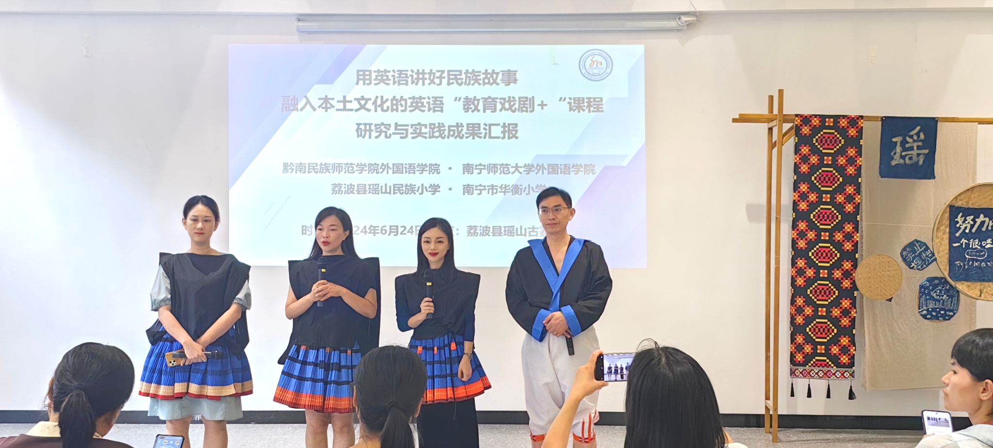 ,协同实践基地学校南宁市华衡小学于 2024 年 6 月 24日赴荔波县瑶山古寨开展“用英语教育戏剧讲好瑶山故事”联合教研活动。本次联合教研活动由荔波县瑶山民族小学韦文丹校长主持,荔波县约150名师生代表参与了本次活动。