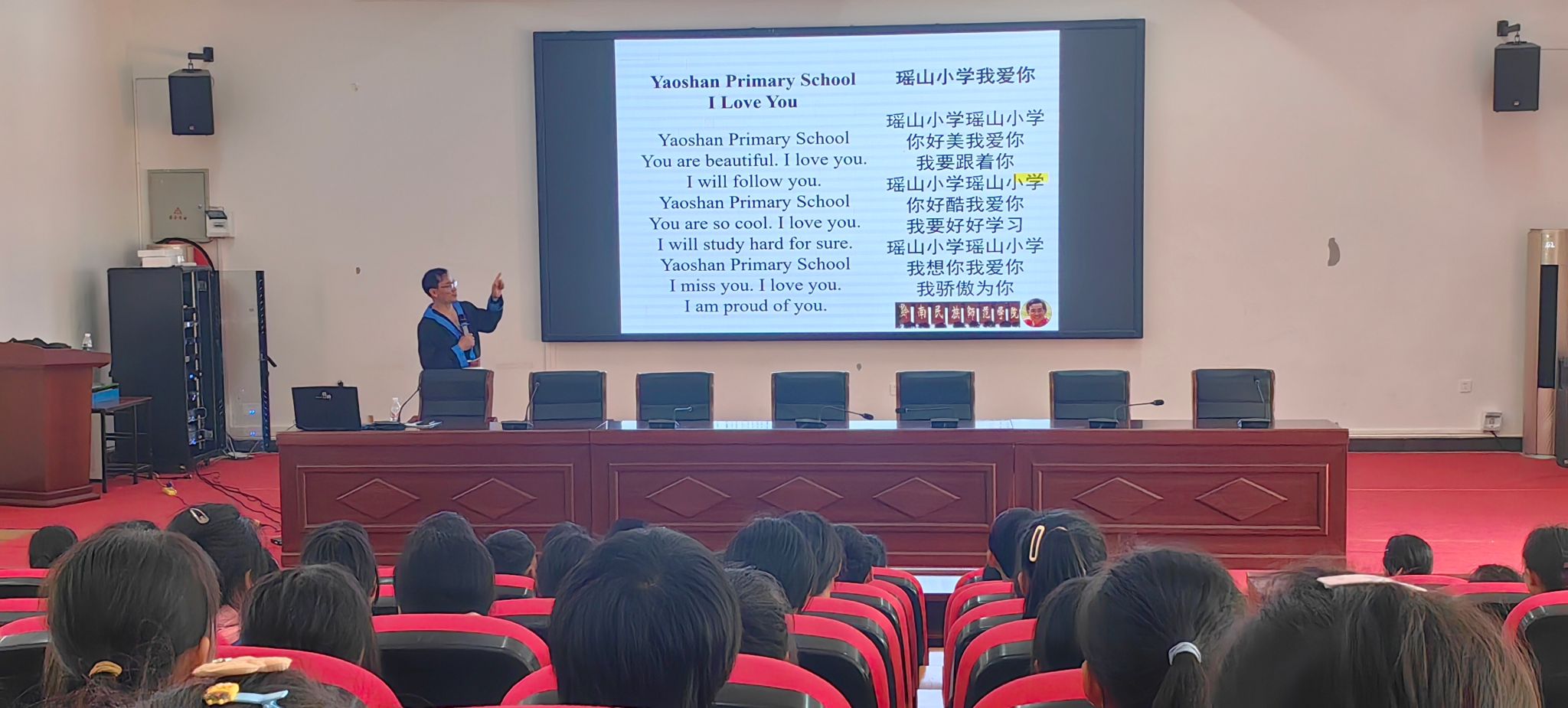 院长韦启卫和南宁市华衡小学科研主任韦静分别化身为“瑶瑶”爸爸和“瑶瑶”妈妈,以客串演员的方式向学生演示了“瑶山五变”之“群众变演员”。其中韦启卫院长用瑶语演唱原创歌曲“瑶山小学我爱你”,韦静老师化身为导游用英语向外国游客讲解“瑶山五变”。通过两位老师的示范,启发学生思考瑶山的过去、现在与未来,提出瑶山变得更美好的建议。