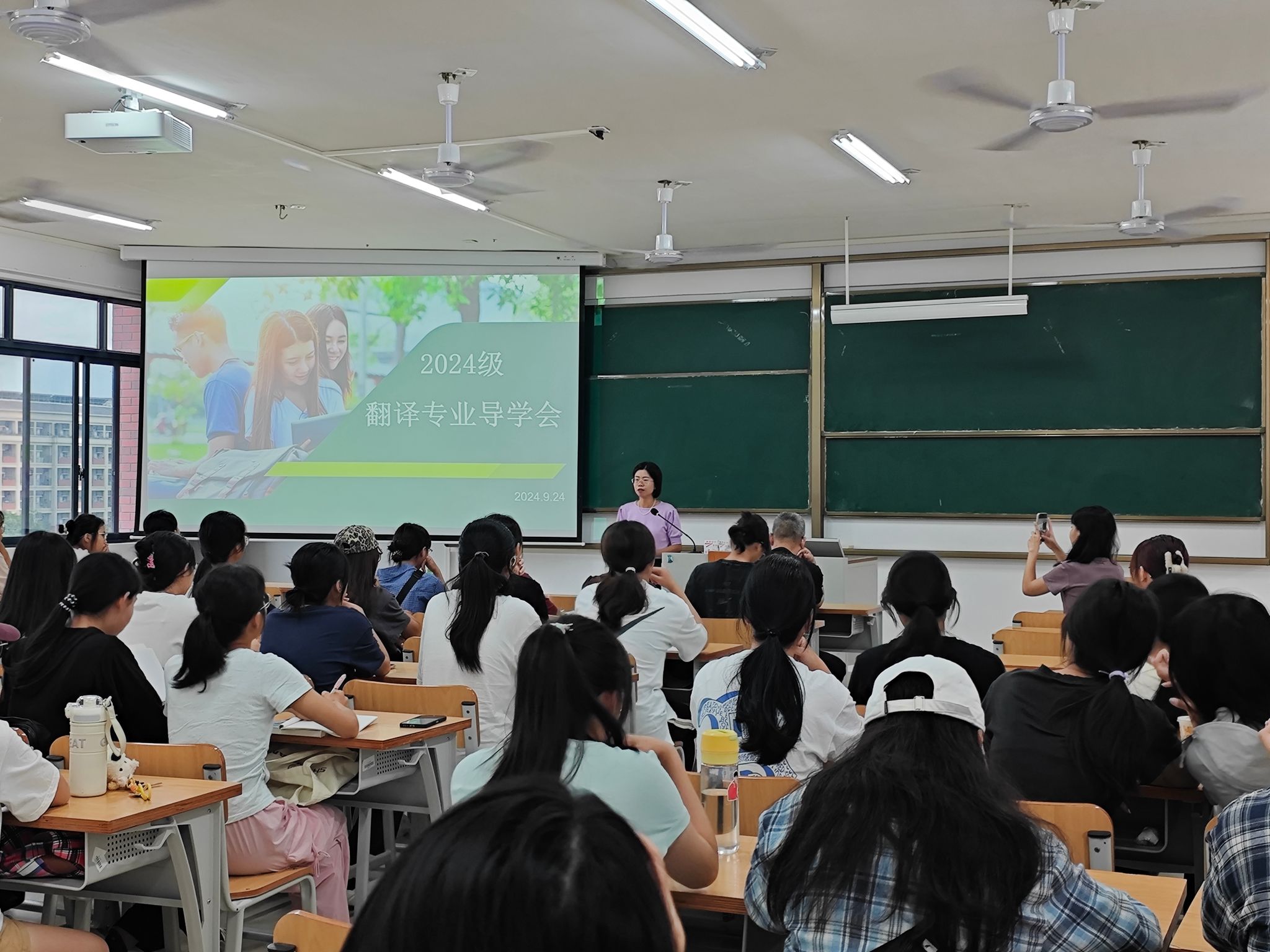 翻译教研室在武鸣校区实验 2C302 教室举行 2024 级翻译专业导学会。本次导学会由教研室主任樊毅主持,唐旭光副教授、范文副教授、黄信副教授、侯艺东老师以及 2024 级翻译 1 班和 2 班的新生共同参与。