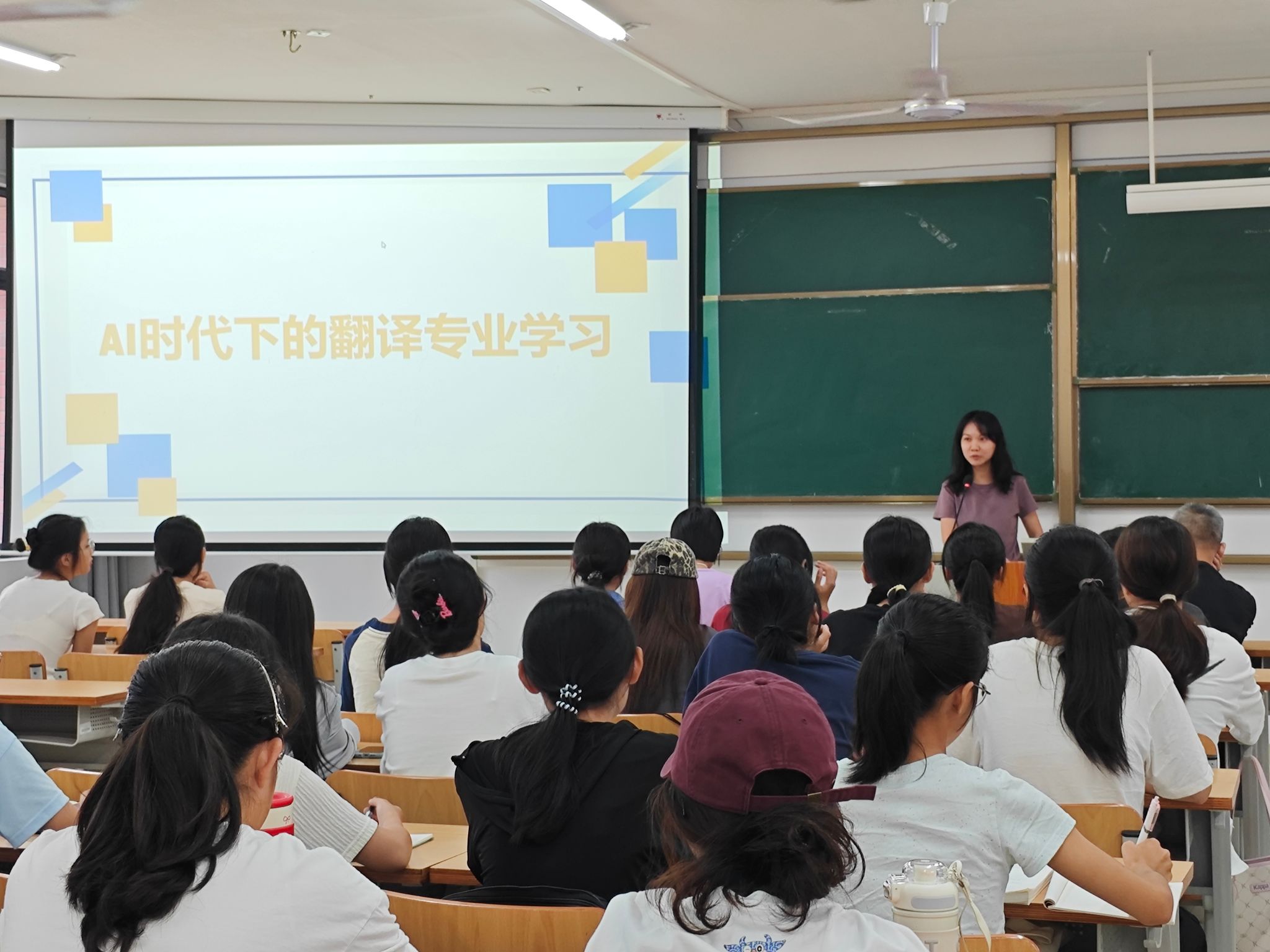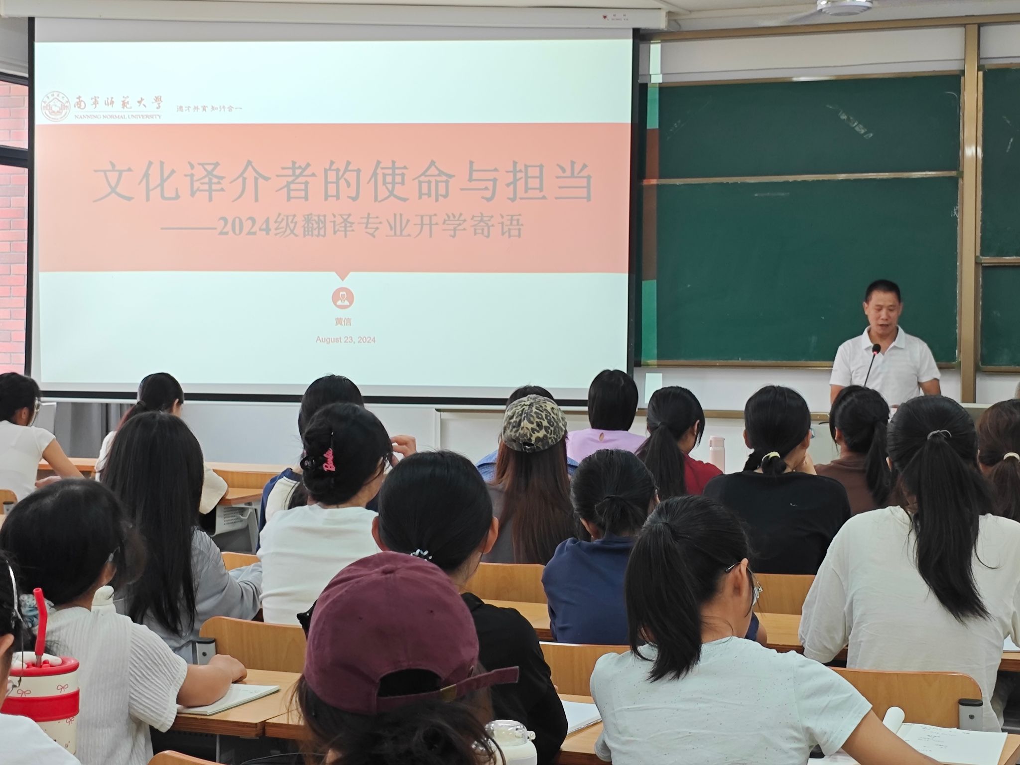 黄信副教授以《文化译介者的使命与担当》为题展开阐述。借助图文并茂的展示和丰富的案例,如 “白衣天使” 的翻译,以及围绕 “用英语讲好中国故事”、中华民族优秀传统文化走出去、中国制造走出去、中国企业走出去、广西民族文化走出去等内容,黄信副教授向同学们阐明了翻译工作者的使命与责任。他强调,翻译工作不仅要走出去,还要能走进去,走入人心。同时,他鼓励同学们加强专业学习,多阅读《China Daily》等英文报刊,关注广西的新闻,广泛涉猎传播学、社会学等各领域知识,努力成为一个知识渊博的杂家。