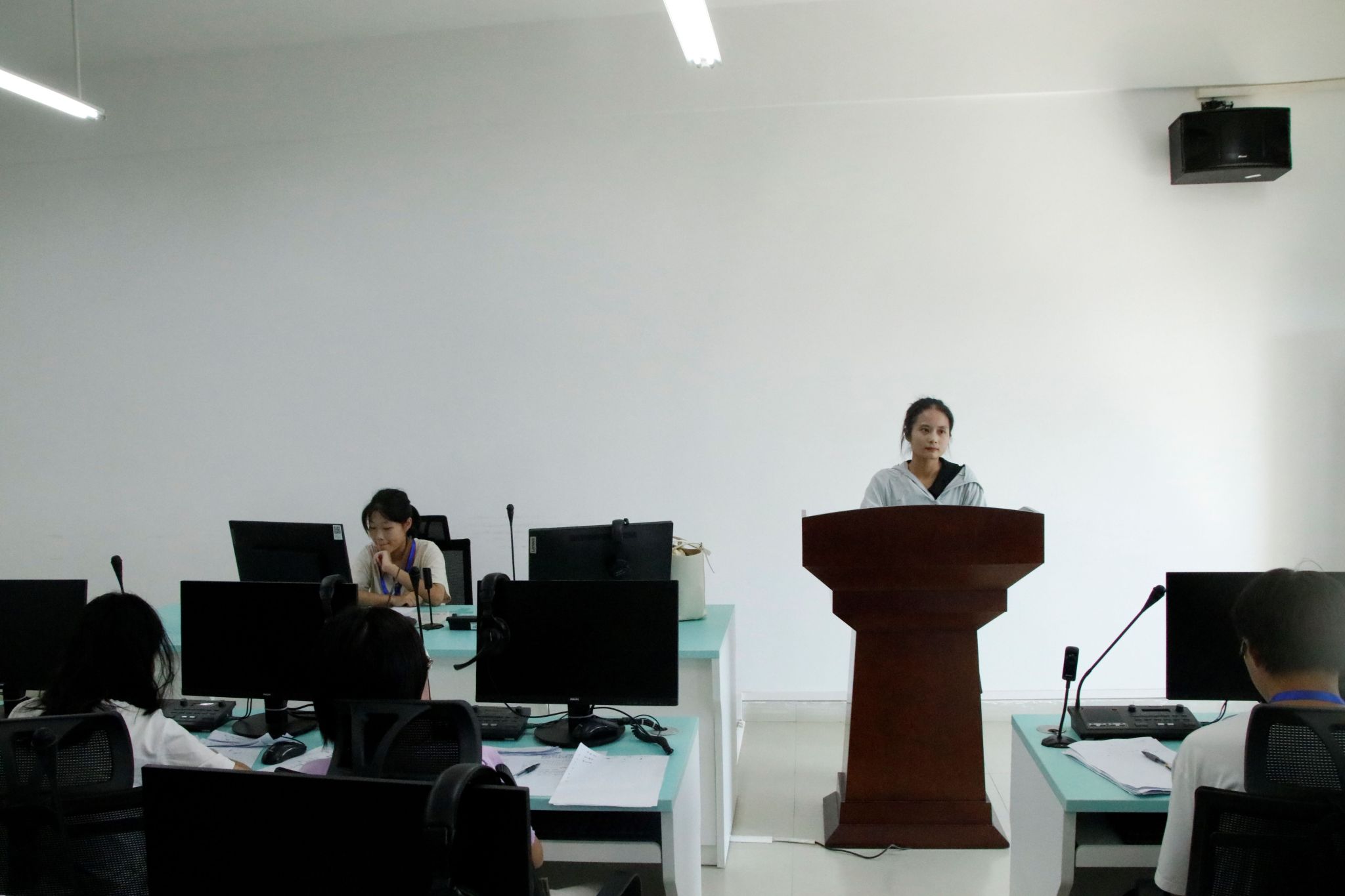 在紧张的比赛中,选手们凭借其扎实的语言基础和敏锐的听力反应,展现出了较高的口译水平。评委席上,樊毅和侯艺东老师也全程关注着选手们的表现,他们的专业评判为比赛的公正性和权威性提供了有力保障。