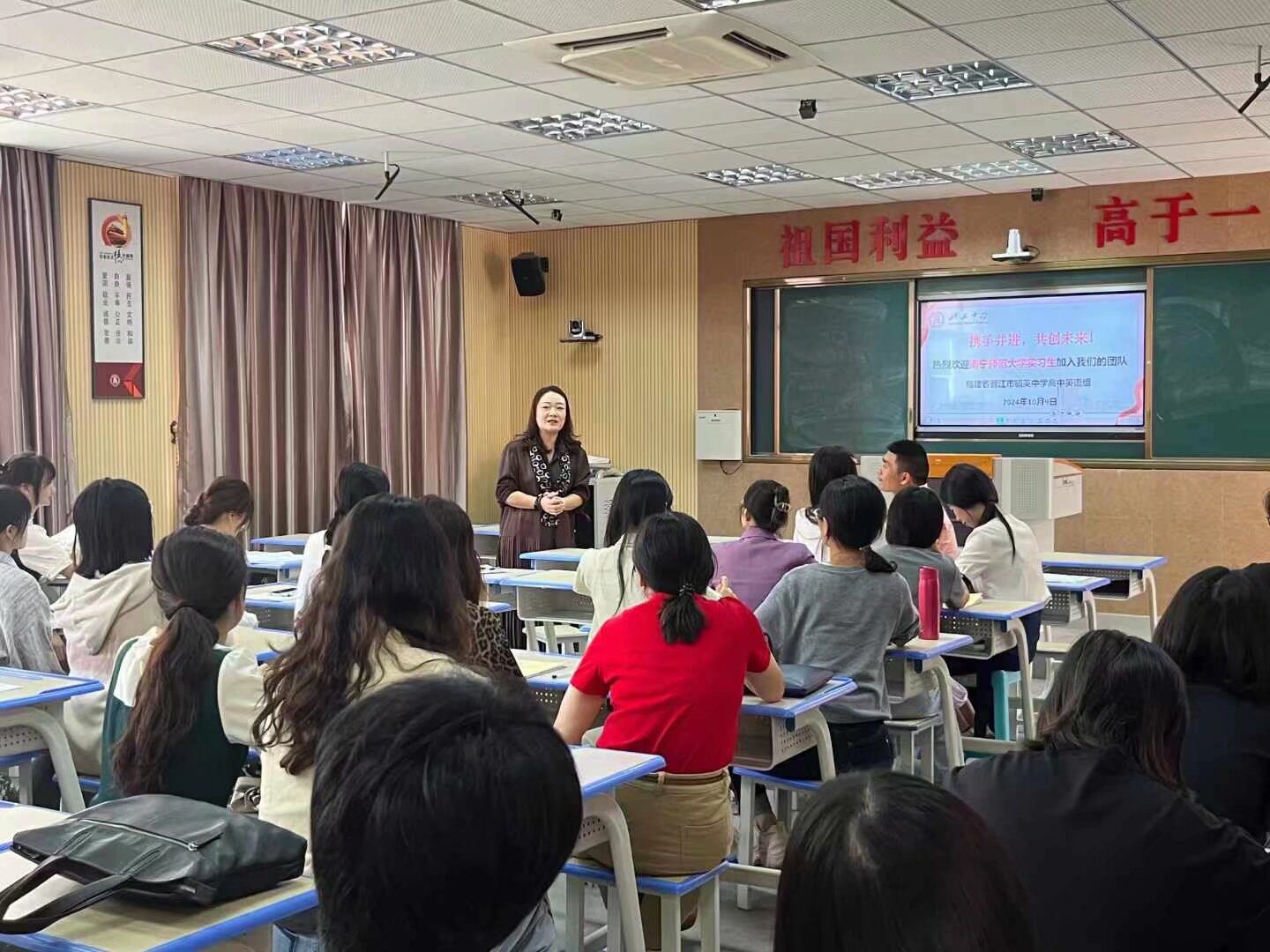 10月9日上午,毓英中学组织召开了全体指导教师与实习生的见面会。见面会由教科室吴海梅主任主持,毓英中学政教处主任、高一高二的年级段长以及一众教学指导老师、H图书馆