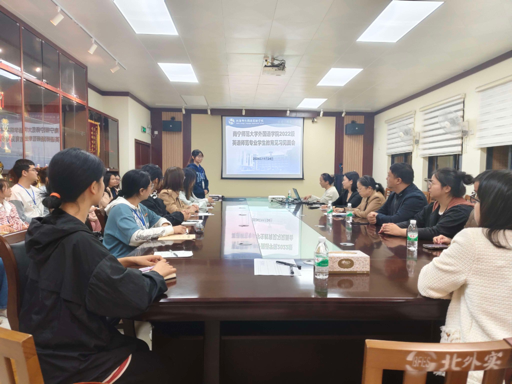 会议伊始,周光辉副校长对北海外国语实验学校进行了简短的介绍,涵盖了学校的历史、办学理念、教学设施及师资力量等方面内容,让见习生们初步了解学校情况。随后,李艳玲副校长宣布了见习分组情况及指导老师名单,详细说明了每组见习生的指导老师及见习班级,确保见习生们能够得到充分的指导和帮助。指导老师代表张颖老师也进行了发言,她表示将全力以赴地指导见习生们进行教学实践,并希望见习生们能够珍惜这次机会,虚心学习,不断进步。
