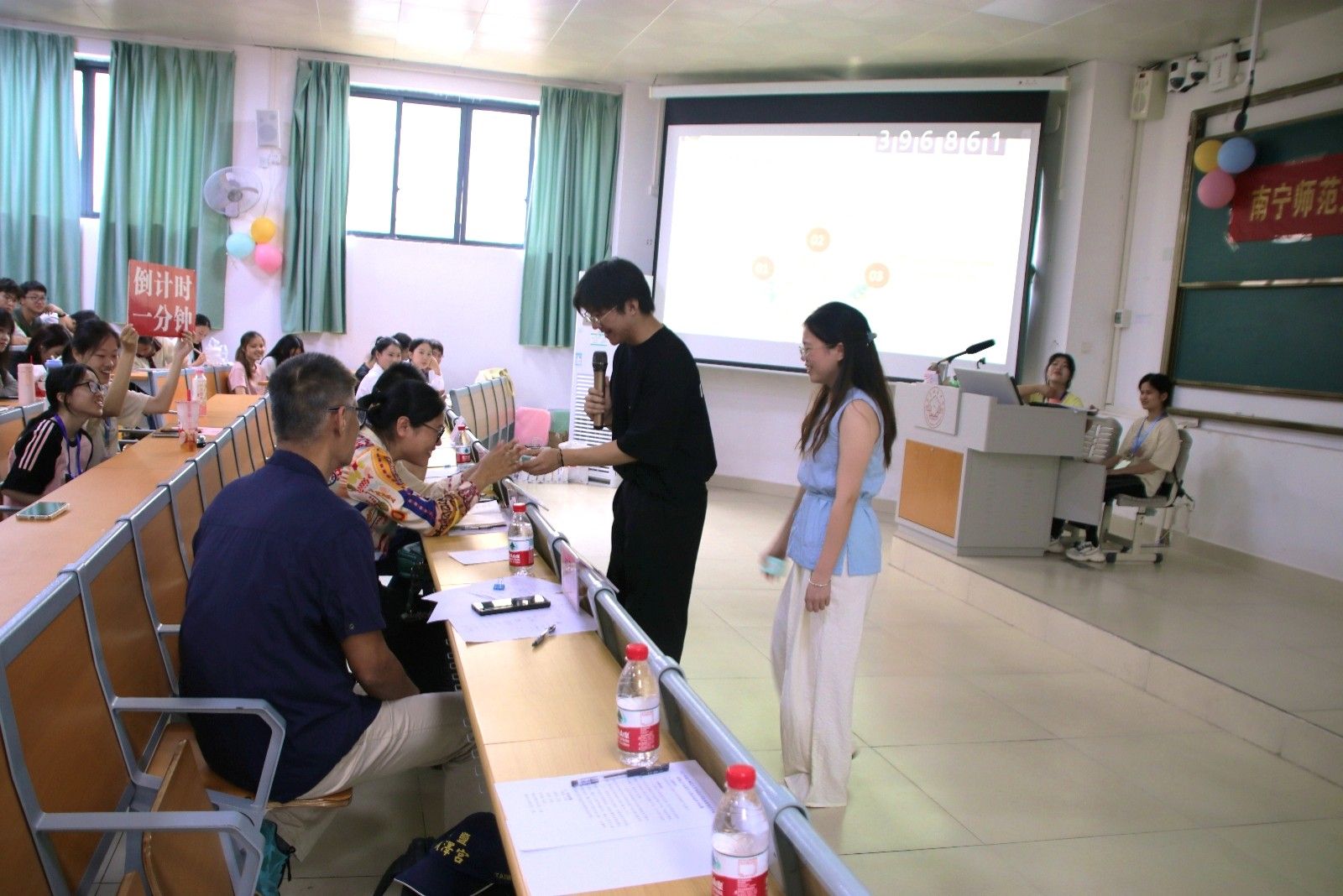 李树娟老师、郑鼎耀老师、覃耀龙老师担任本次大赛的评委,学工办黄慧梅老师出席本次活动。
