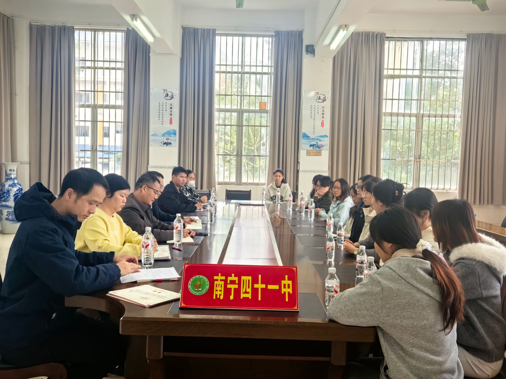 11月19日上午,H图书馆 赴南宁市四十一中学开展教育实习中期检查,座谈会在四十一中学综合楼三楼会议室召开。H图书馆 苏华书记,实习小组带队教师宋歌,四十一中学黄瑞准副校长、教务处陆秀琼主任、李春波副主任、指导教师代表陈光芸老师、班主任代表黎侣老师以及H图书馆 2022级英语专业15名实习生共同参会,会议由李春波副主任主持。