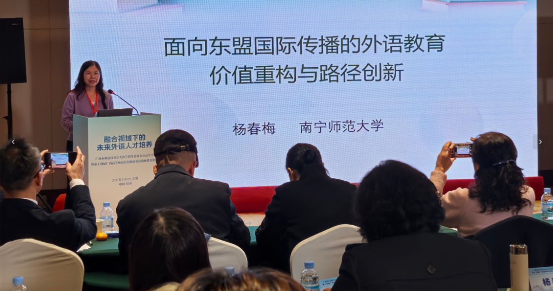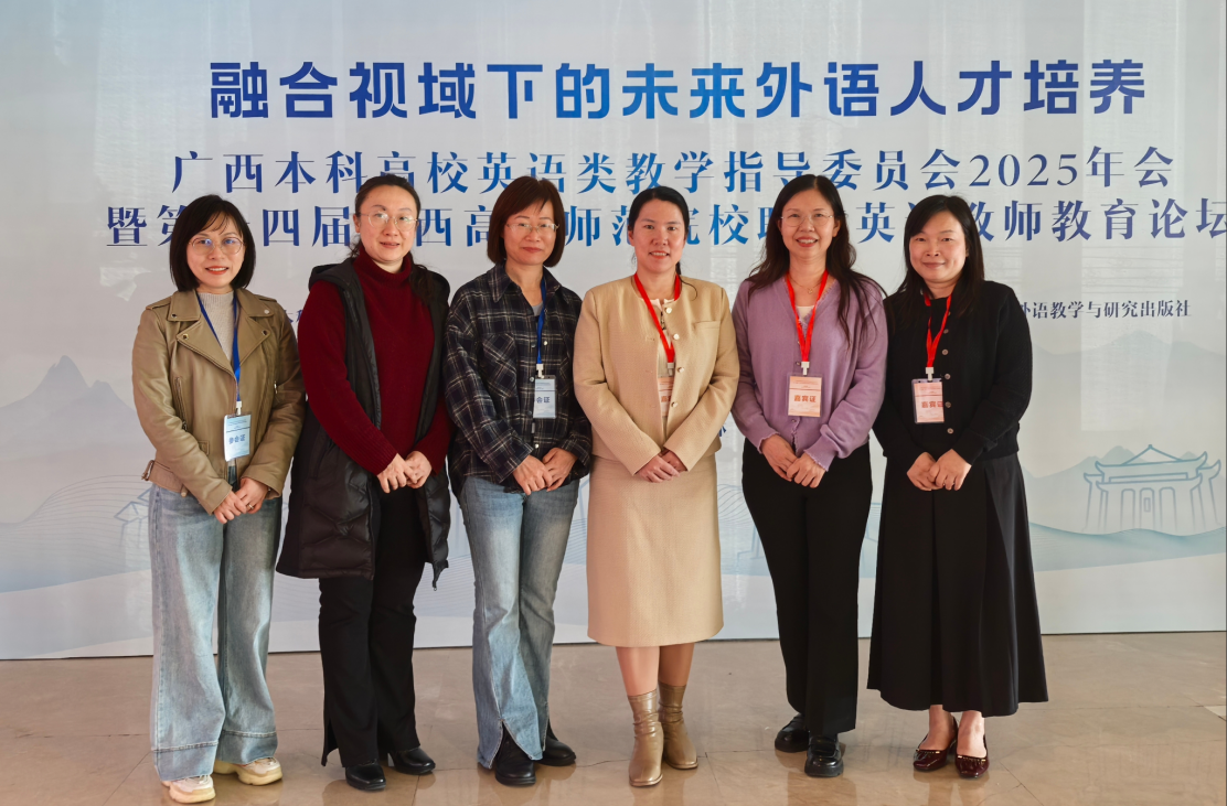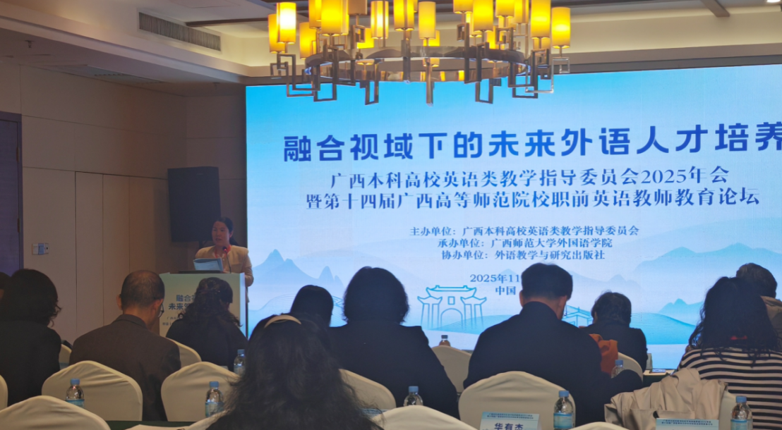 副院长高飞雁率邓芳娇、刘婷婷、夏莉等教师赴桂林参加广西本科高校英语类教学指导委员会2025年会暨第十四届广西高等师范院校职前英语教师教育论坛。首先,广西本科高校英语类专业教学指导委员会主任李晓致辞,对英语专业教学寄予殷切期望,接着会议围绕英语教育教学创新和实践、AI与外语教育融合、师范生培养等议题,邀请了区内外专家分享经验。