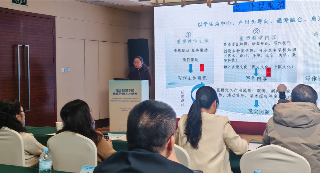 教师杨春梅作为广西本科高校英语类教指委秘书长做了“面向东盟国际传播的外语教育价值重构与路径创新”的报告,为外语专业内涵重塑提供了框架和路径,特邀嘉宾蒙岚副院长进行了会议主持和点评,英语系主任刘婷婷以“超越‘纯语言’:通专融合理念驱动下的英语写作课程重塑”为题,在大会上分享南师大经验:基于英语写作课的教学目标和困境,提出了以学生为中心、产出为导向,通过重塑教学主体、教学内容、教学场景,建立多元化评价机制,实现通专融合,启迪创新。