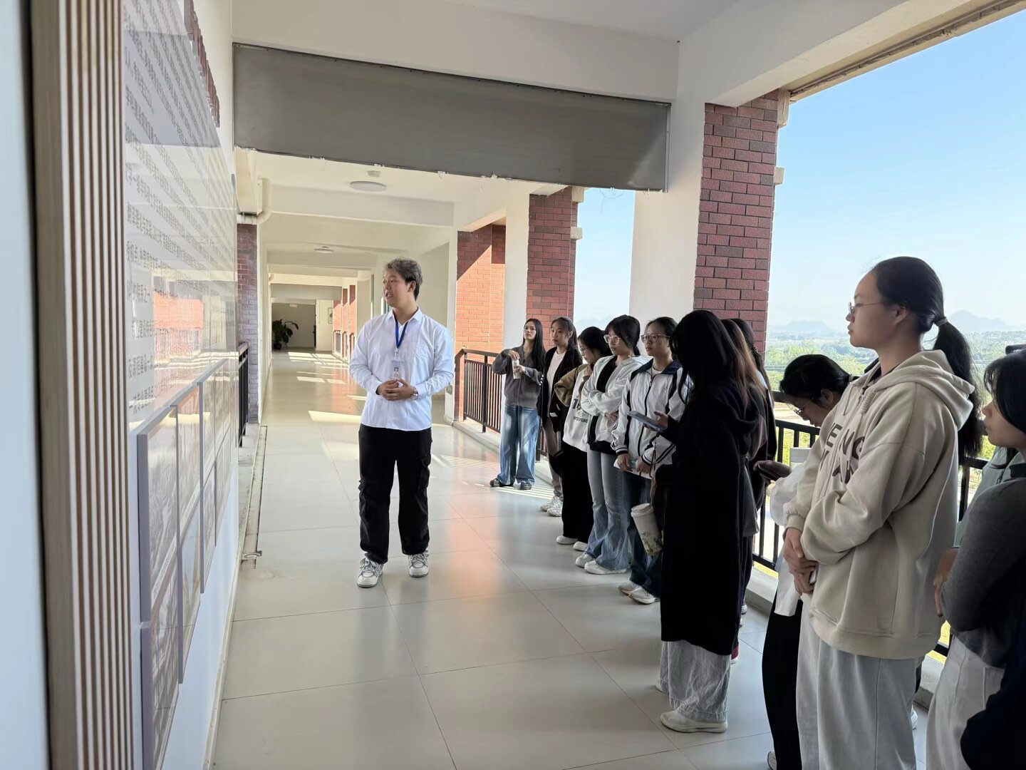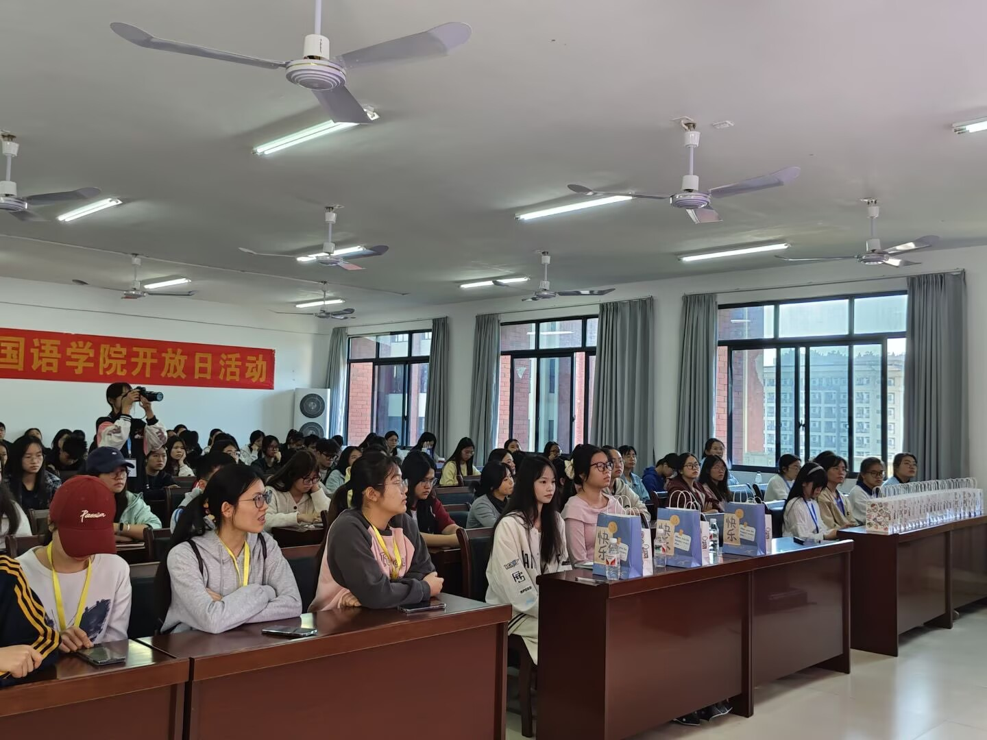 的文化长廊与语言实验室。文化长廊生动展现了学院的发展历程、党建引领成果、人才培养、师资力量及优秀校友风采等;而语言实验室的开放则让同学们近距离体验了同声传译、日语文化、虚拟仿真等现代化教学设施,现场气氛活跃,交流互动热烈。