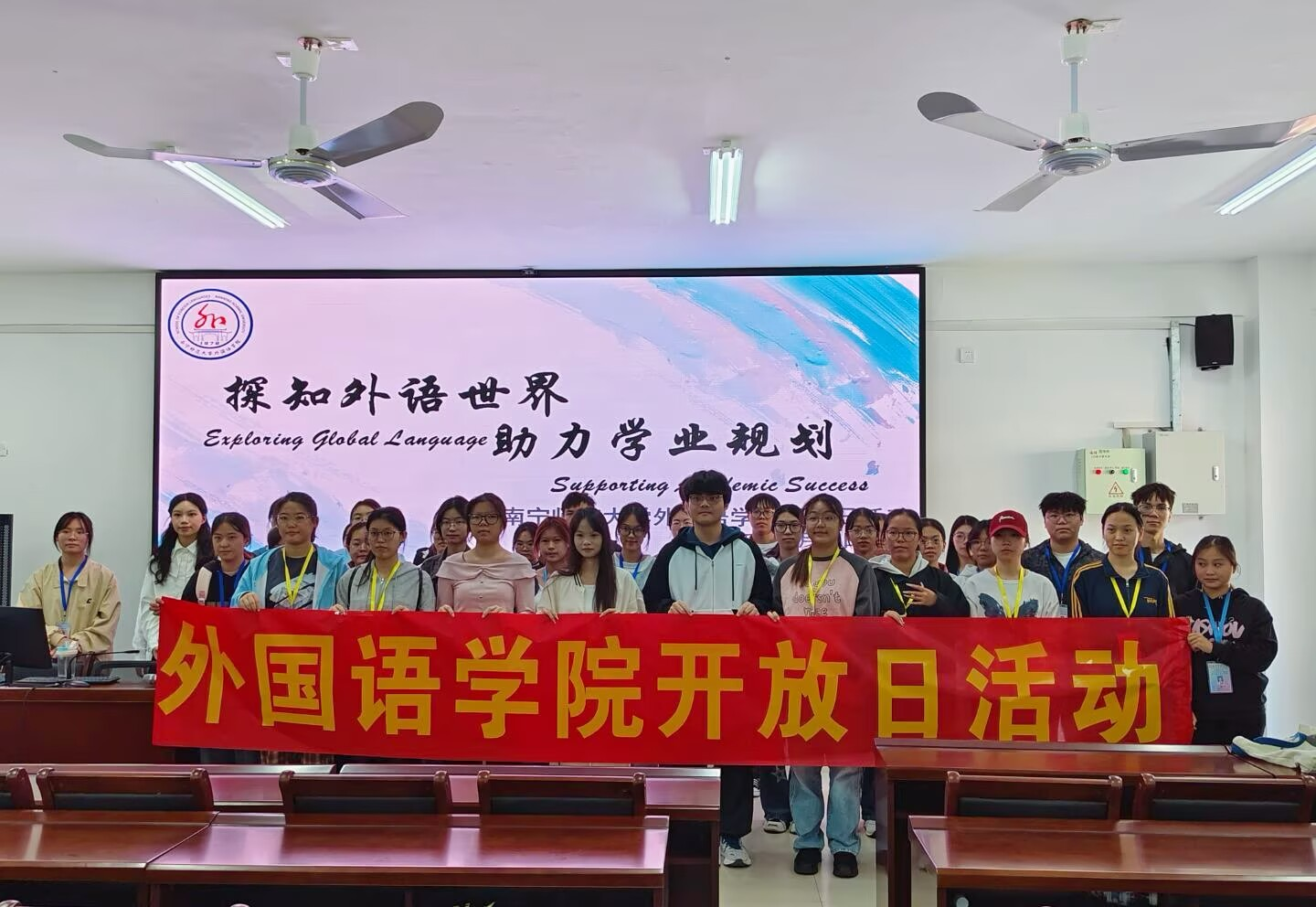 在武鸣校区1号实验楼B座顺利举办了以“探知外语世界,助力学生规划”为主题的校园开放日活动。本次活动面向全校学生,旨在展示学院学科特色与优质教学资源,为学生搭建深入了解外语学习与未来发展的平台。