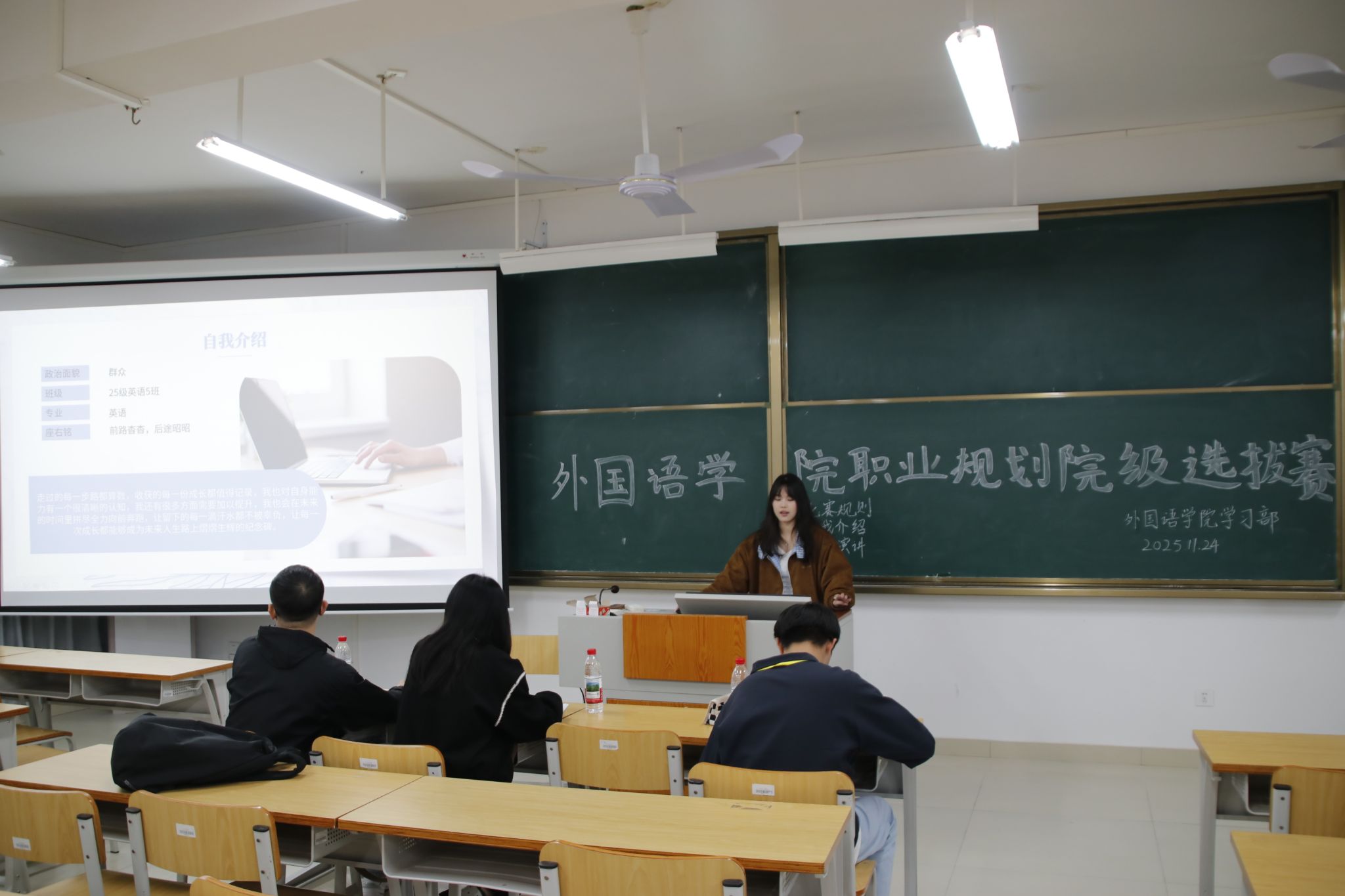 经过初步筛选,共有二十七名选手作为参赛代表站上了决赛舞台。比赛分为“自我介绍”和“主题演讲”两个环节。赛场外,候场选手摩拳擦掌、蓄势待发;赛场内,参赛选手沉着自信、各展风采。比赛过程中,评委们全程认真聆听,并依据评分标准进行审慎考量。选手们则借助精心准备的PPT,深入阐述了对自身专业的理解,并展示了逻辑清晰、务实可行的职业生涯规划,充分体现了外院学子立足专业、规划未来的能力与风采。