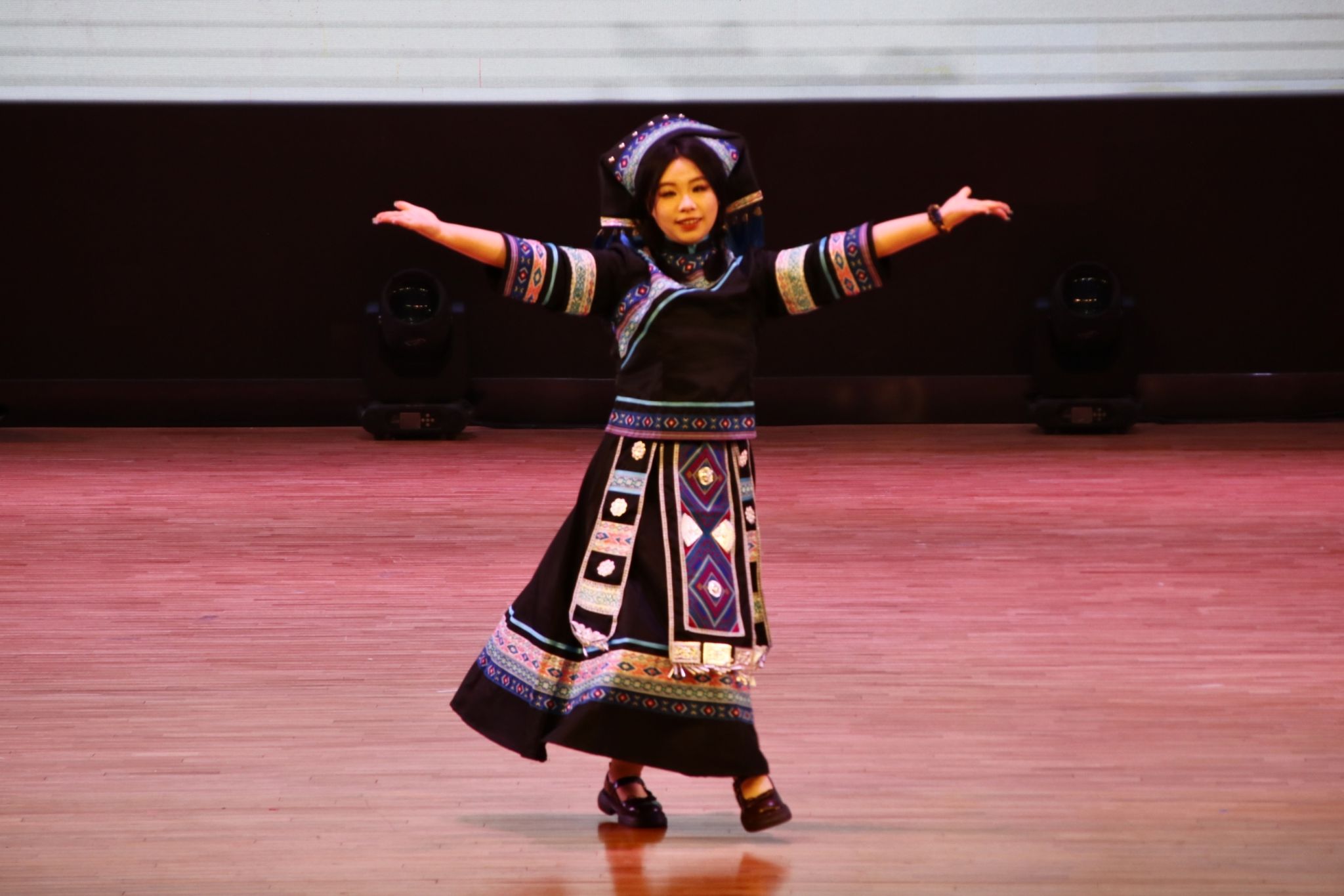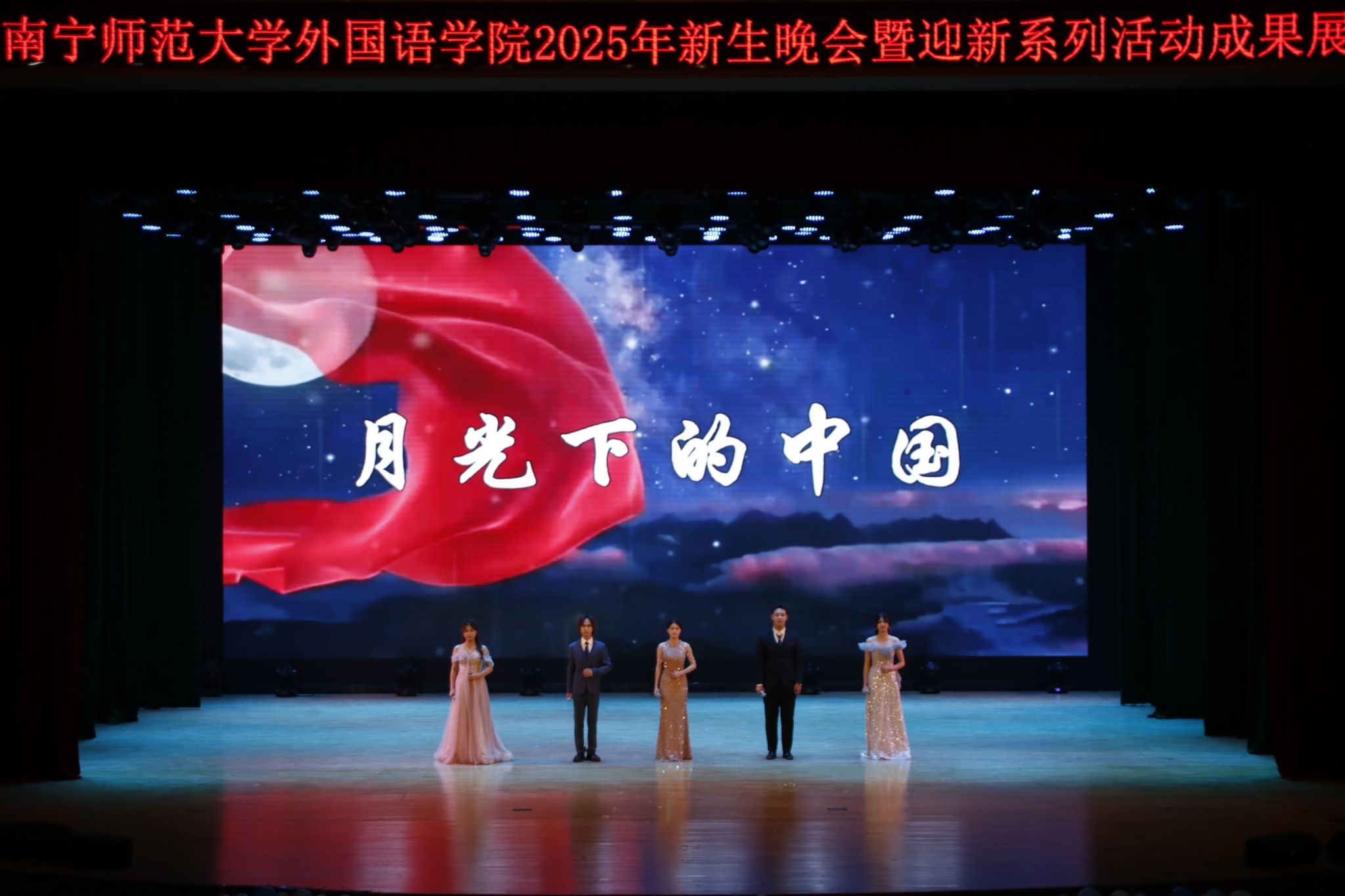 FLD艺术团带来开场舞《Power》,以动感节奏点燃了全场热情。晚会分为“新语初声·青春同频”“艺展新程·星向远方”两大篇章,节目形式多样、精彩纷呈。第一篇章中,独唱《Love Yourself》、舞蹈《花儿纳吉》及情景剧《芯火相传:壮乡回响》等节目,展现了外院学子的多元艺术才华与蓬勃朝气;第二篇章中,传统服饰走秀《旗韵醉江南》融合古典美学与现代风范,彰显文化传承;朗诵《月光下的中国》以深沉的情感和铿锵的韵律,深深感染现场观众,将晚会推向高潮。