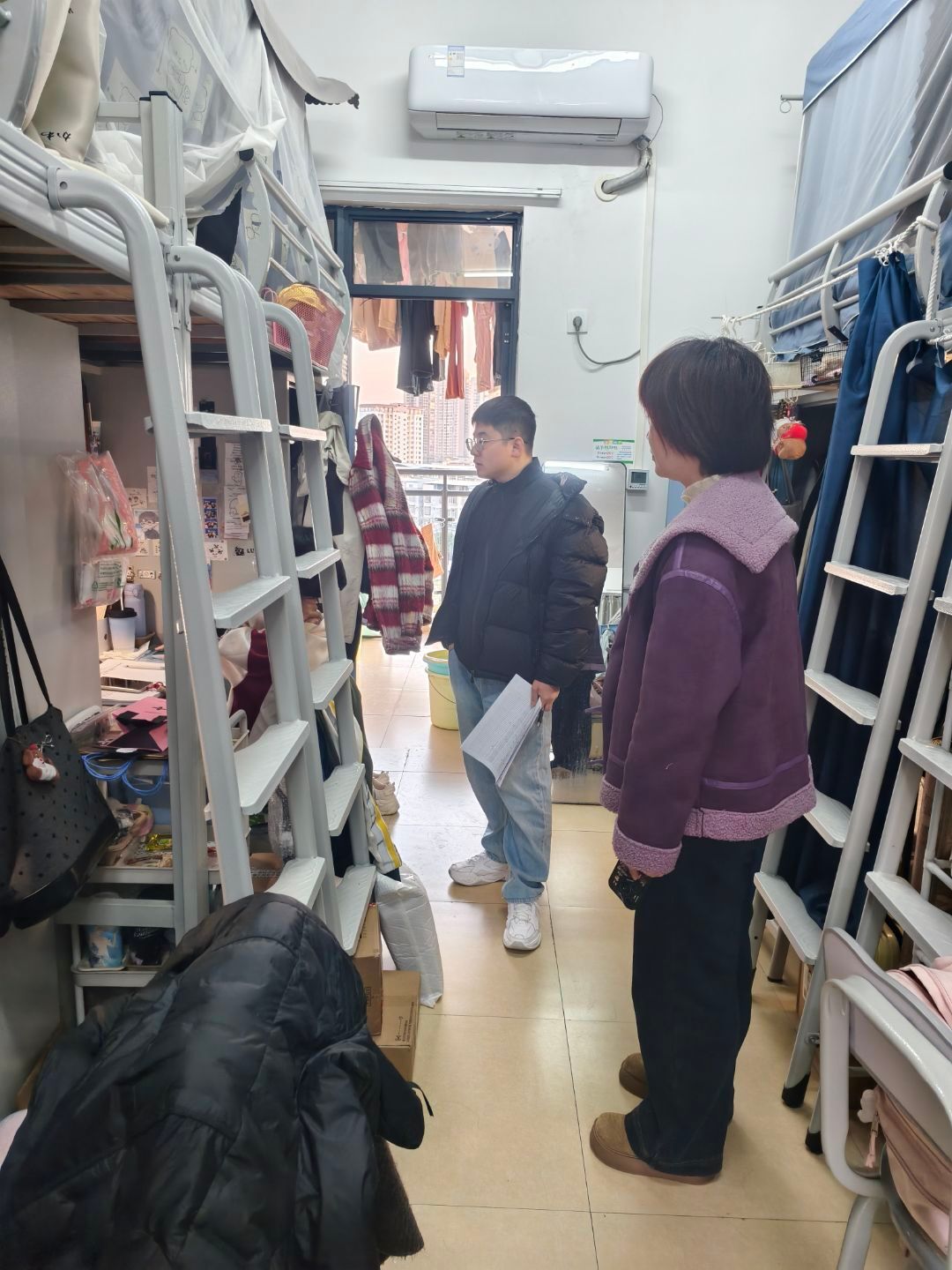 此次走访聚焦宿舍安全与卫生两大核心,重点排查大功率电器、私拉乱接电线、违规使用明火等安全隐患,同时检查宿舍内务整理、卫生清洁、物品摆放及垃圾分类等情况。走访中,领导、辅导员与学生“拉家常”,问学业、聊就业,亲切细心询问大家的近况,提醒大家增强防火、防盗、防触电意识,各宿舍做到人走断电、门窗上锁,贵重物品妥善保管,确保宿舍安全。