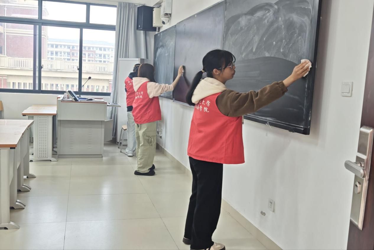 本次活动设置三大环节,覆盖校园服务与社区联动。3月17日,志愿者参与“擦亮讲台,致敬师恩”活动,在实验楼认真擦拭课后黑板、清理板槽粉笔灰,用劳动整洁教学环境,践行奉献精神。