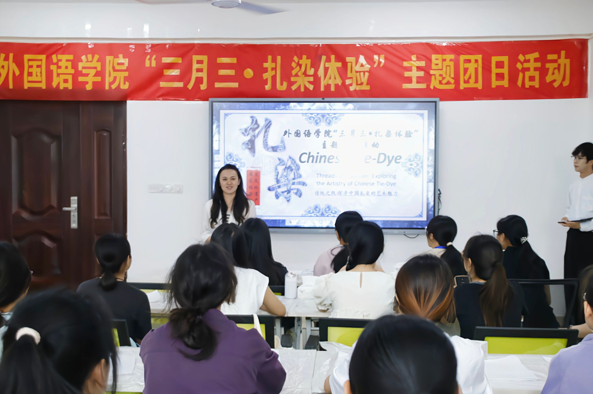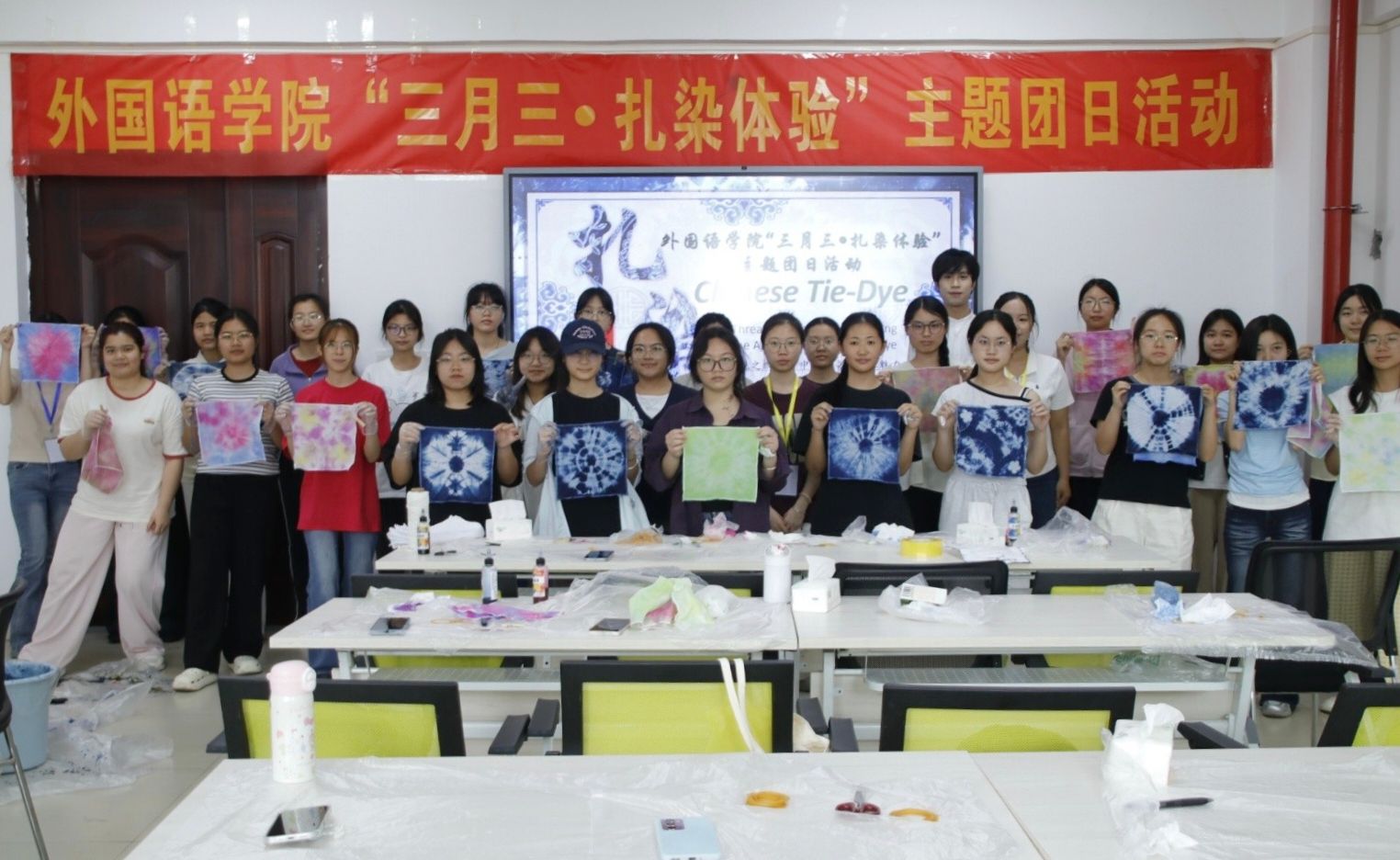 在实验楼1B-516会议室举办“蓝染匠心,韵染‘三月三’”主题团日活动。此次活动以扎染非遗技艺体验为载体,巧妙融合学院英语专业特色,让学生在动手实践中感受传统技艺的魅力。