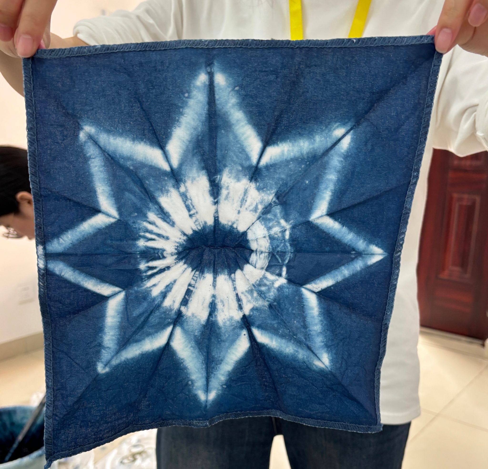 随后,活动进入扎染体验环节。主持人结合现场演示,用英文讲解了扎染工艺中的扎结、染色、晾干三大流程,接着在工作人员的组织下,同学们亲自动手体验,完成各道工序。大家充分发挥创意,制作出独具特色的扎染方巾,现场气氛热烈,作品异彩纷呈。