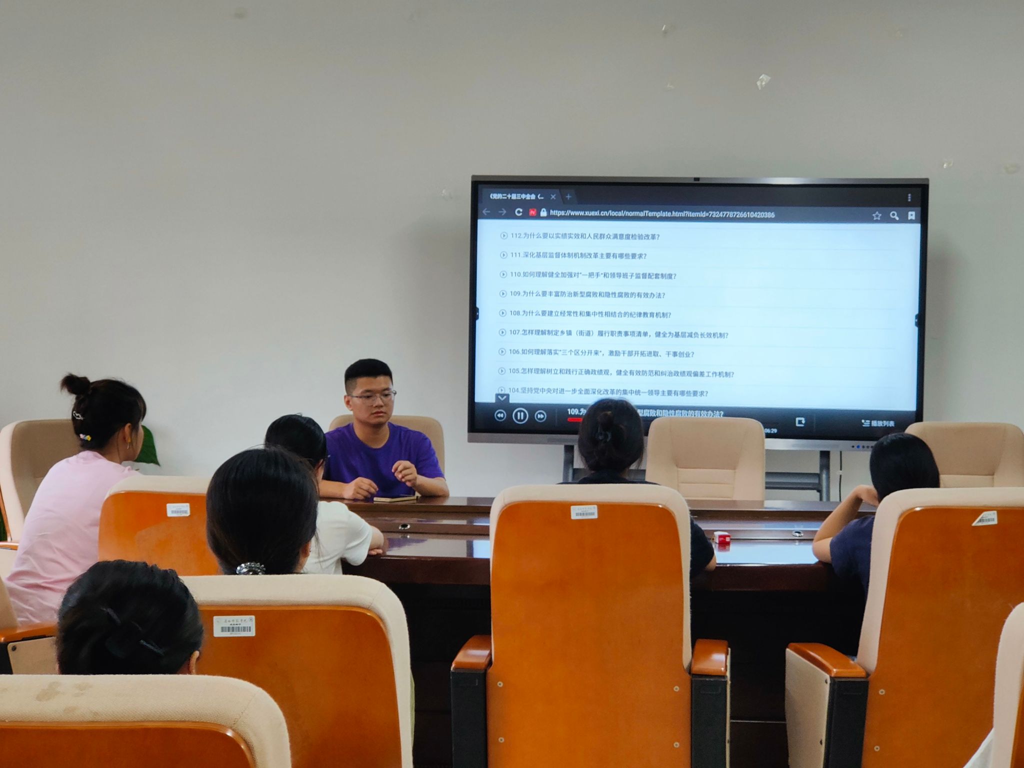 首先,主持人陈林林同志简单介绍本次学习流程,并对党的二十届三中全会召开背景作简要介绍。会议的第二个环节,党员通过有声读物的形式,对《决定》中与学生党员密切相关的内容进行学习。活动帮助全体学生党员丰富理论知识,对进一步了解义务教育优质均衡机制和学生实习制度等具有实际意义,有助于党员们更好利用学习成果指导自身实践。