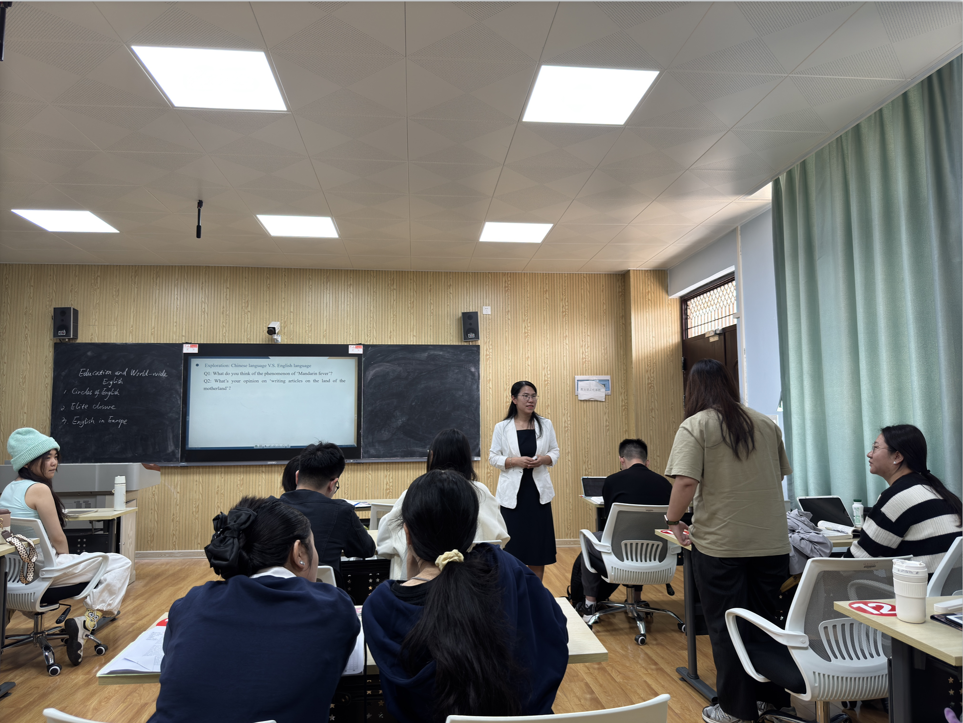 蒙岚副院长主讲,讲授的课程是英语语言文学专业、外国语言学与应用语言学专业的研究生课程《社会语言学》。公开课上,蒙教授以专业课程内容为基石,巧妙地融入思政元素。在讲解英语在教育中的影响时,蒙教授通过引入丰富的案例,将思想政治教育自然地渗透其中。例如,在探讨“英语圈”、“精英封闭”等社会语言学概念时,引导学生思考英语在不同英语圈国家中发挥的作用。由此联系到英语与汉语国际地位的对比,以此引出汉语的国际地位日益提升,吸引了越来越多的汉语学习者。蒙老师还播放了一段“汉语热”的视频片段,生动形象地展现了世界对汉语需求的日益增长。同时蒙老师引用了习近平总书记的讲话,强调了要将论文写在祖国大地上。她引导学生积极思考,让学生在掌握语言技能的同时,深刻领悟到用英语讲好中国故事的重要性。