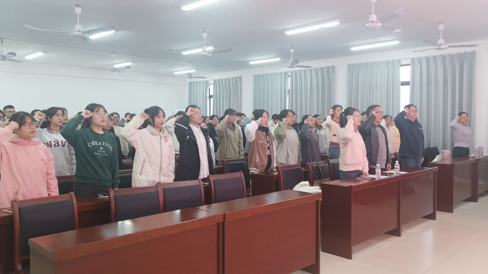 其次,在主持人莫晓滢的领誓下,全体党员紧握右拳,面向鲜红的党旗,庄严宣誓。一句句铿锵有力的誓言,表达了他们对党的忠诚与决心。紧接着,新党员代表刘静怡同志发言,她表示党一直是她心中的灯塔,引领着她前行的方向。她承诺,将以实际行动践行“全心全意为人民服务”的宗旨。同时,她还呼吁新党员们携手并进,用实际行动兑现今天的誓言,争做合格的中国共产党党员。