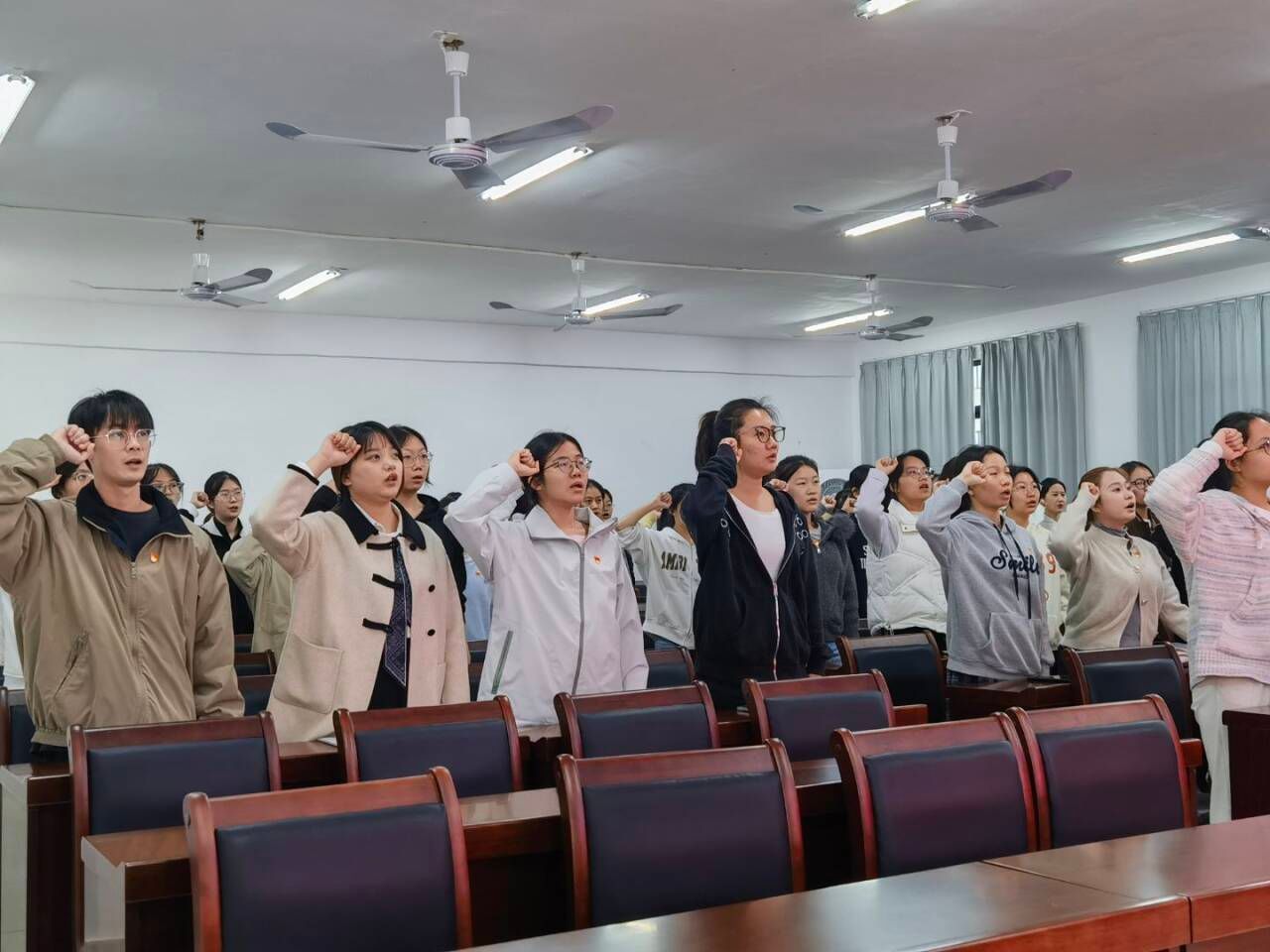 在实验楼1B-515教室举办2025年下半年新发展党员入党宣誓仪式。该仪式共有65名新发展的党员参加。