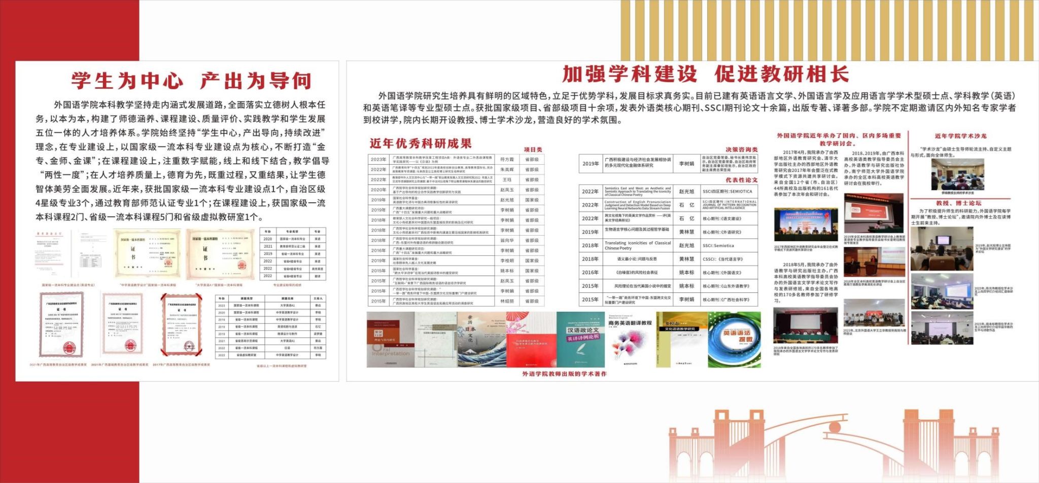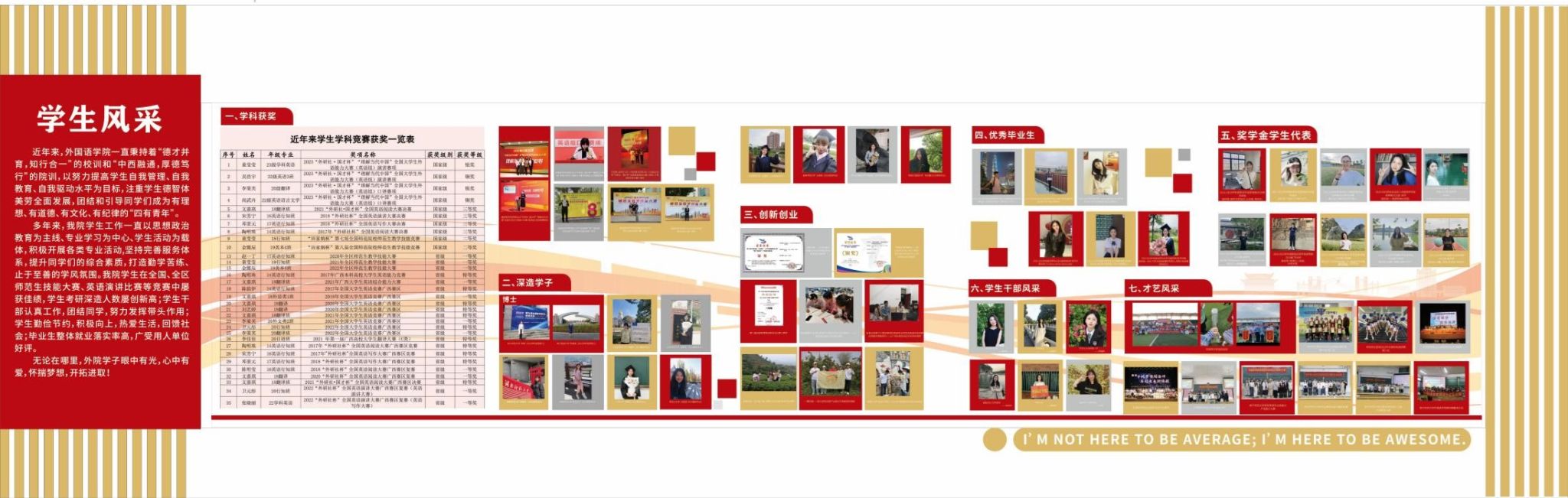 学生具有良好的思想道德素质、扎实的语言基础和专业技能,在各类专业竞赛中多次取得优异成绩,如全国大学生外语能力大赛金奖、外研社国才杯外语能力大赛国赛铜奖、全国师范院校师范生教学技能竞赛二等奖、全区师范生技能大赛一等奖、全国大学生英语竞赛省级一等奖、广西翻译大赛特等奖、广西大学生日语演讲比赛一等奖等。