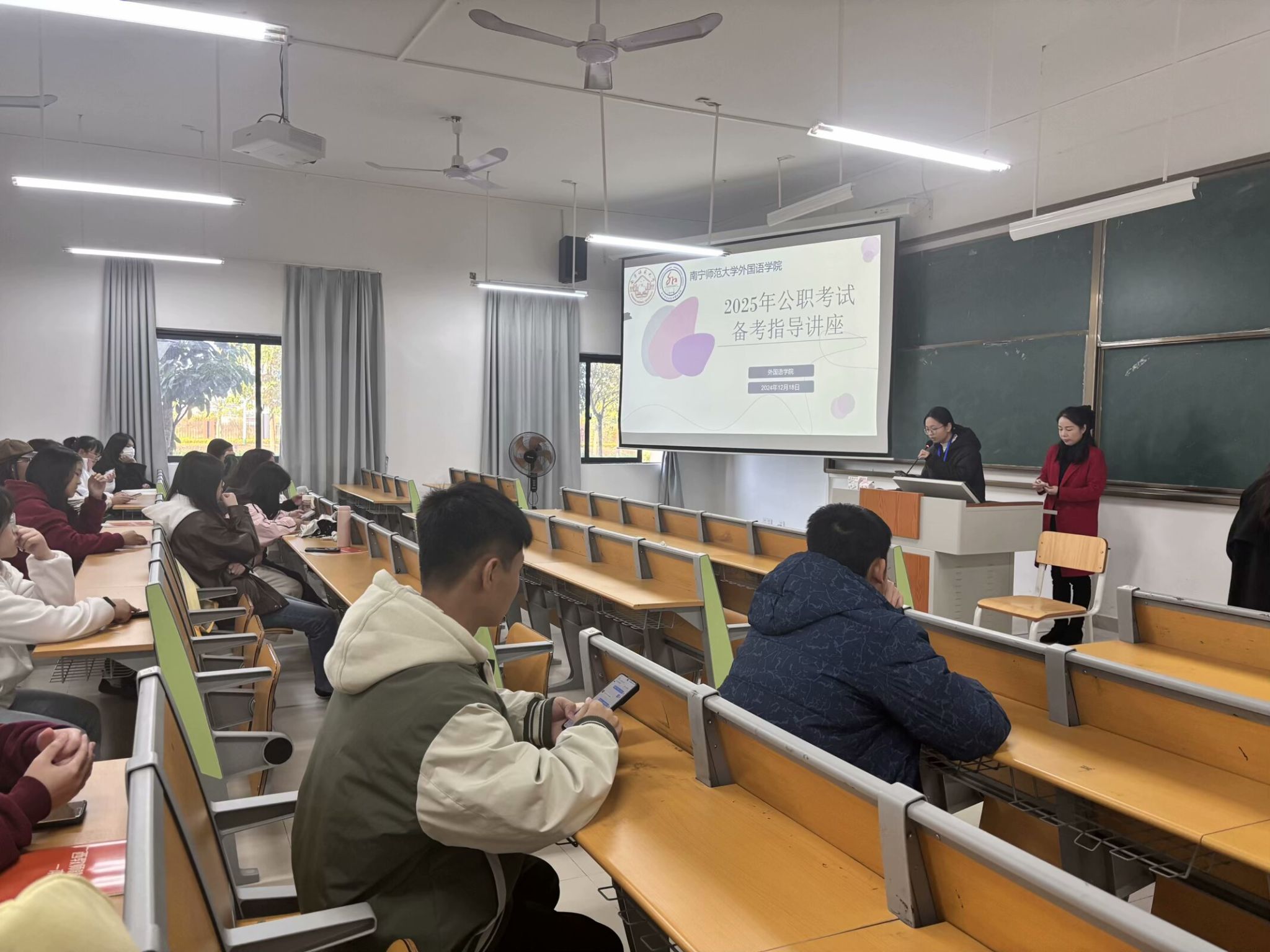 于2024年12月18日在实验楼2-A102教室举办了以志公教育蒋梦媛老师为主讲的2025年广西公职考试备考指导讲座,并于12月20日在实验楼1-B515教室举办了以志公教育陈沙沙老师为主讲的大学生就业指导讲座。
