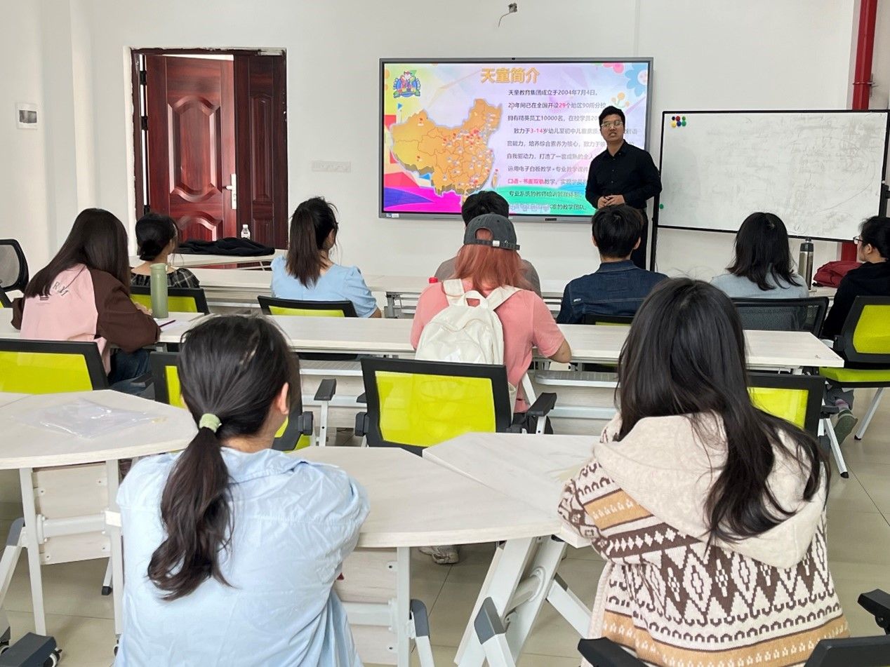 随后,天童教育主管许传志老师进行了全面而细致的公司介绍。他通过丰富的案例和详实的数据,分享了公司自成立以来的发展历程,从初创时的锐意进取到如今在行业内的斐然成就。在人才培养体系方面,着重介绍了公司独特的培训模式,为新入职员工量身定制成长路径,助力其快速成长为行业精英。此外,还列举了公司历年所获荣誉,彰显了公司在业内的卓越实力。对于同学们最为关心的招聘岗位信息及福利待遇,许主管也一一作了详细说明,涵盖薪资待遇、职业晋升空间、员工福利等多个维度,并明确阐述了公司的用人标准和要求,让同学们对未来的职业发展有了更为清晰的认知。